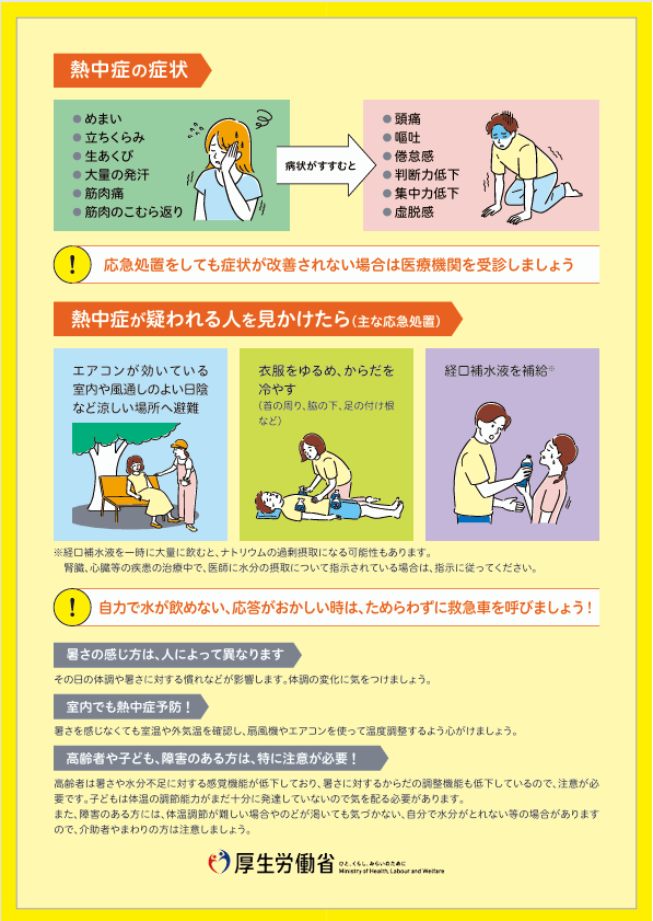 熱中症に注意が必要な時期です。就業の際は屋内外を問わず、こまめに水分補給を取るようにお願いいたします。また、体調が悪いときは休養をとるなど無理をしないようにしましょう。