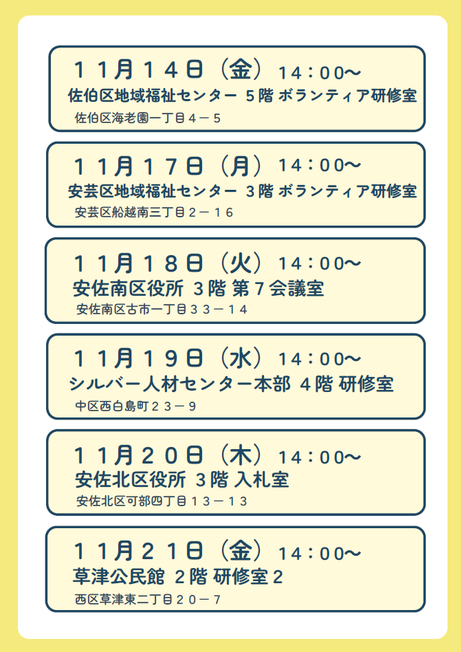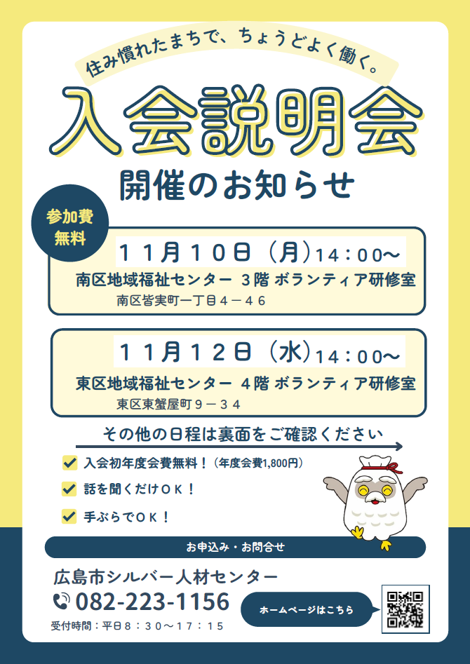 お知らせ ホームお知らせ入会説明会日程のご案内(11月) 2025年10月15日 入会説明会日程のご案内(11月) 申し込みは、広島市シルバー人材センター事務局まで ☎082-223-1156 一覧に戻る