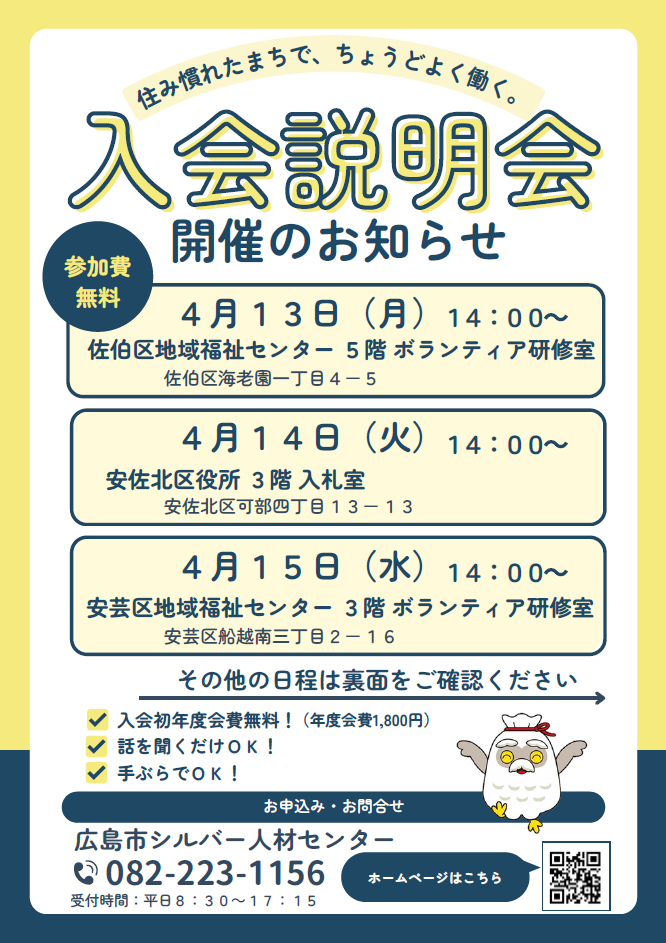 申し込みは、広島市シルバー人材センター事務局まで ☎082-223-1156