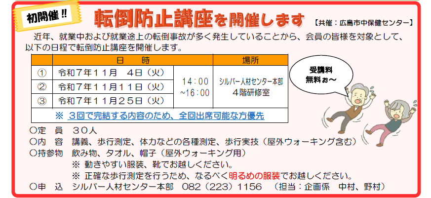 近年、就業中および就業途上の転倒事故が多く発生していることから、会員の皆様を対象として、次の日程で転倒防止講座を開催します。講座では、歩行測定など様々な測定結果をお渡しし、現状の確認や改善に役立つアドバイスをいただきます。